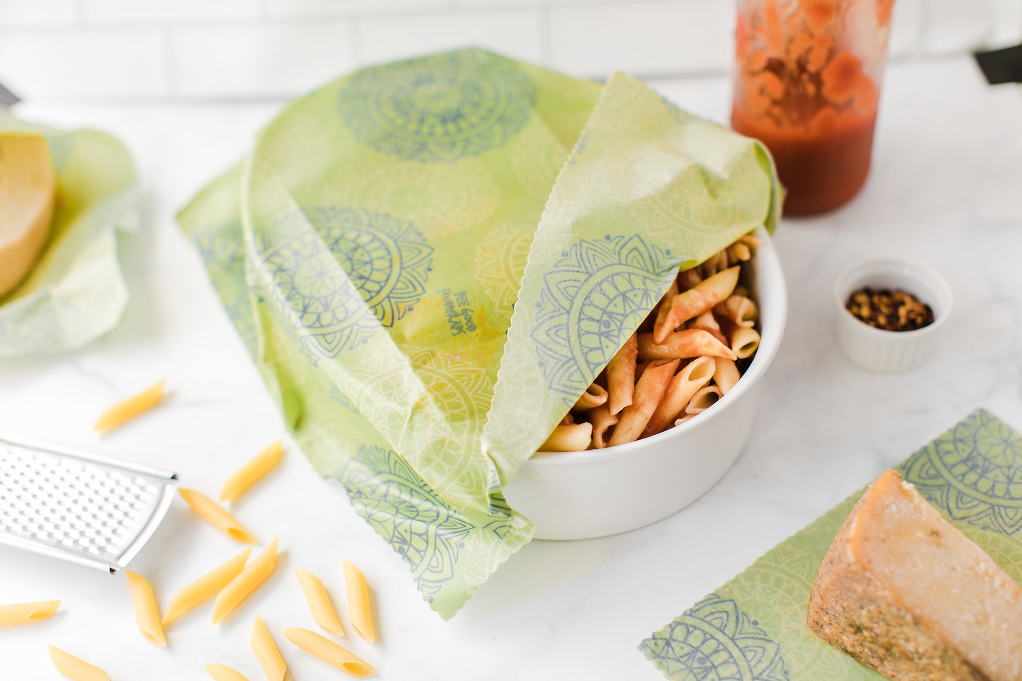 Large wraps are 14×14 in, making them ideal for wrapping mixing bowls, square baking dishes, round pie pans, a sandwich, and large fruit or vegetables.