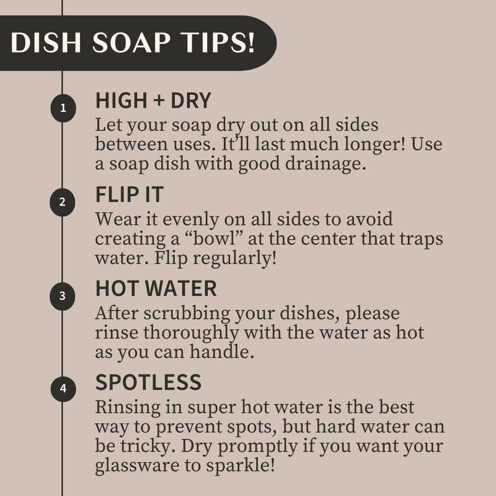 CARE+USE: Using a wet brush, cloth, or sponge, rub Solid Dish Soap to build up lather. Wash dishes as usual, and rinse thoroughly. To get the best out of your soap, always allow the bar to dry thoroughly between uses. We recommend using a soap dish with excellent drainage and air circulation, and flipping the bar regularly to wear evenly on all sides.