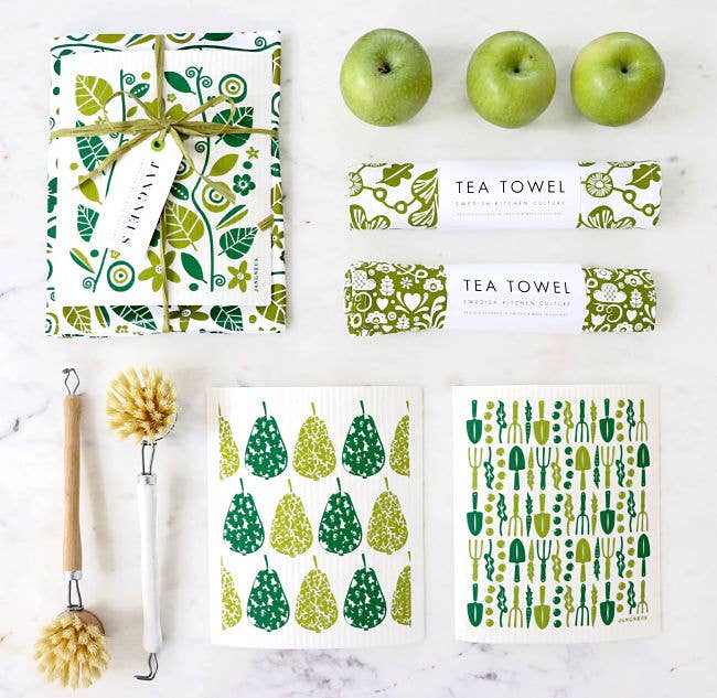 These sponge cloths are guaranteed to bring fresh Scandinavian style into your kitchen. Used in Swedish kitchens since the 1950s, these tried and trusted dishcloths are made of all natural and renewable materials. Highly durable, they are great for washing up, general cleaning and mopping up spills. Matching kitchen towels are available to keep your kitchen looking smart and coordinated. Highly absorbent, they can absorb 15 times its own weight in water. Machine washable. Designed by Jangneus in Sweden. Size: W6.75"x L8". 100% biodegradable. Made of 70% cellulose and 30% cotton